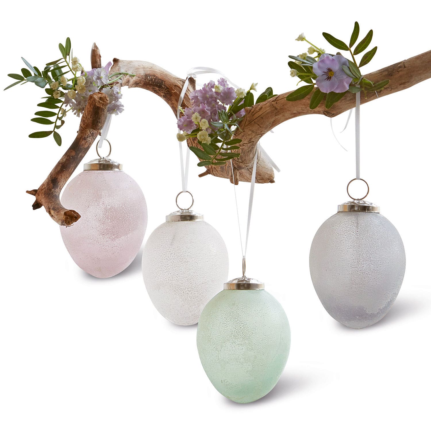 Die feinen und sehr leichten Glaseier glänzen in zarten Pastellfarben und verbreiten eine gemütliche Osterstimmung. Ob an Zweigen hängend oder dekorativ in einer Schale platziert, die zarten Farben erfreuen täglich. Dank ihres besonderen Finishs glitzern die Glaseier besonders schön im Sonnenlicht. Mit einer Eisenaufhängung zum Aufhängen versehen, können Sie hübsche Bänder befestigen und die Eier an Sträuchern oder Zweigen anbringen. Ein pastellfarbenes Osterfest steht bevor.