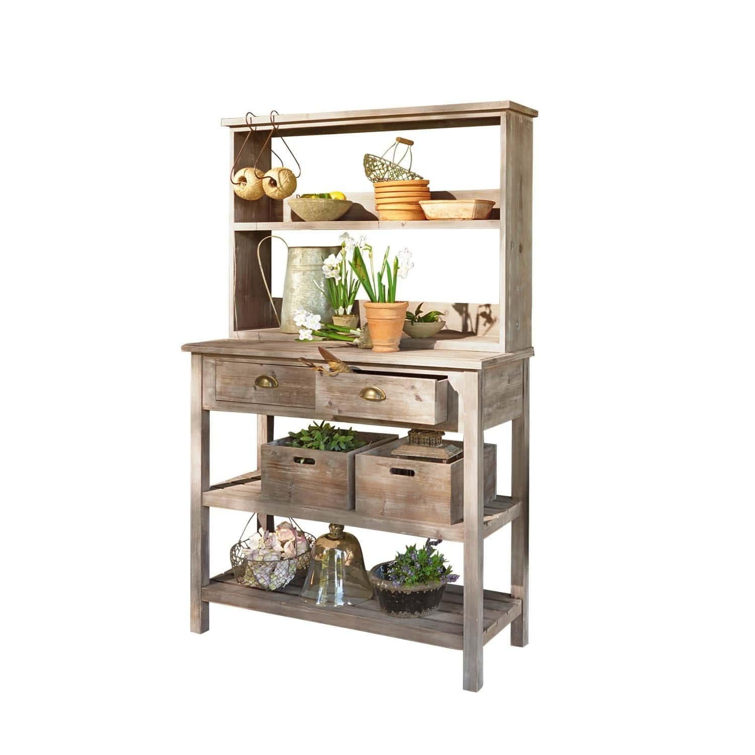 Dieser Pflanztisch aus handgearbeitetem Holz entpuppt sich als dekorativ und praktisch zugleich. Mit seiner Antik-Lasur ist dieses Möbelstück für den Außenbereich mit kleinem Platzbedarf reich an Stauraum und bietet ausreichend Arbeitsfläche zum Umtopfen und Pflegen von kleinen Pflanzen. Vier Ablageböden, zwei Schubladen und zwei herausnehmbare Holzkisten helfen dabei, Ordnung zu halten und effizient zu arbeiten. Um möglichst lange Freude an diesem hölzernen Pflanztisch mit natürlichem Charme zu haben, empfehlen wir, ihn etwas geschützter aufzustellen, da das schöne Tannenholz keinen dauerhaften direkten Regen oder lange Wochen unter einer Schneehaube verträgt. Eine Alternative wäre das Umfunktionieren einer Abdeckplane für Gartenmöbel, da der Pflanztisch dafür durchaus klein genug ist.