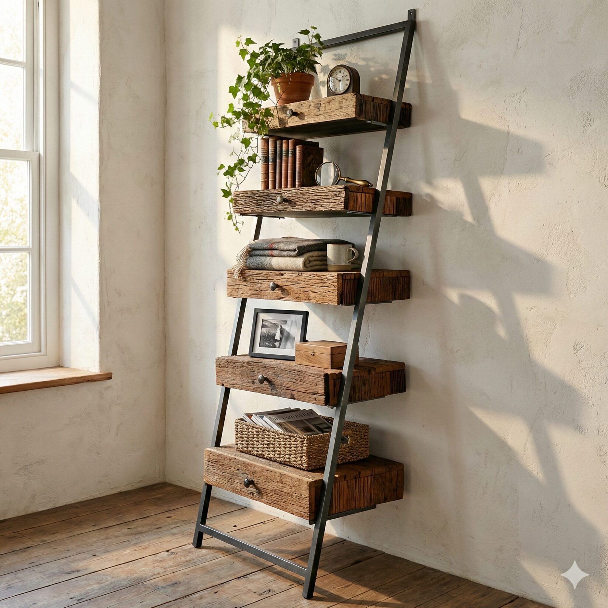 Schlicht in der Form, beeindruckend in der Raumwirkung. Ein Leiterregal wird immer Aufmerksamkeit erregen, egal ob es an der Wand im Wohnzimmer, im Esszimmer, im Badezimmer oder im Eingangsbereich lehnt. Seine einzigartige Anziehungskraft verdankt es neben der Leiterform vor allem der markanten Holzmaserung. Wie vermutet, handelt es sich um recyceltes Salbaumholz, dem in einem aufwändigen Prozess ein zweites Leben geschenkt wurde, was seine Ausstrahlung noch verstärkt. Doch neben dem Design wurde auch die praktische Seite nicht vergessen, da das Regal anstelle von herkömmlichen Regalböden Schubladen hat. Dies ermöglicht es Ihnen, auch weniger dekorative Gegenstände auf attraktive Weise zu verstauen, die dennoch griffbereit sein sollen. Das Regal fügt sich auch auf kleinstem Raum perfekt ein, da es zwar hoch an der Wand ist, aber nur eine Tiefe von ca. 40 cm hat. Die antikbraunen Schubladen werden von einem schlichten Eisengestell gehalten, das ideal zur natürlichen Holzoberfläche passt. Die Eisengriffe an den Schubladen sind ebenfalls hübsch verziert.