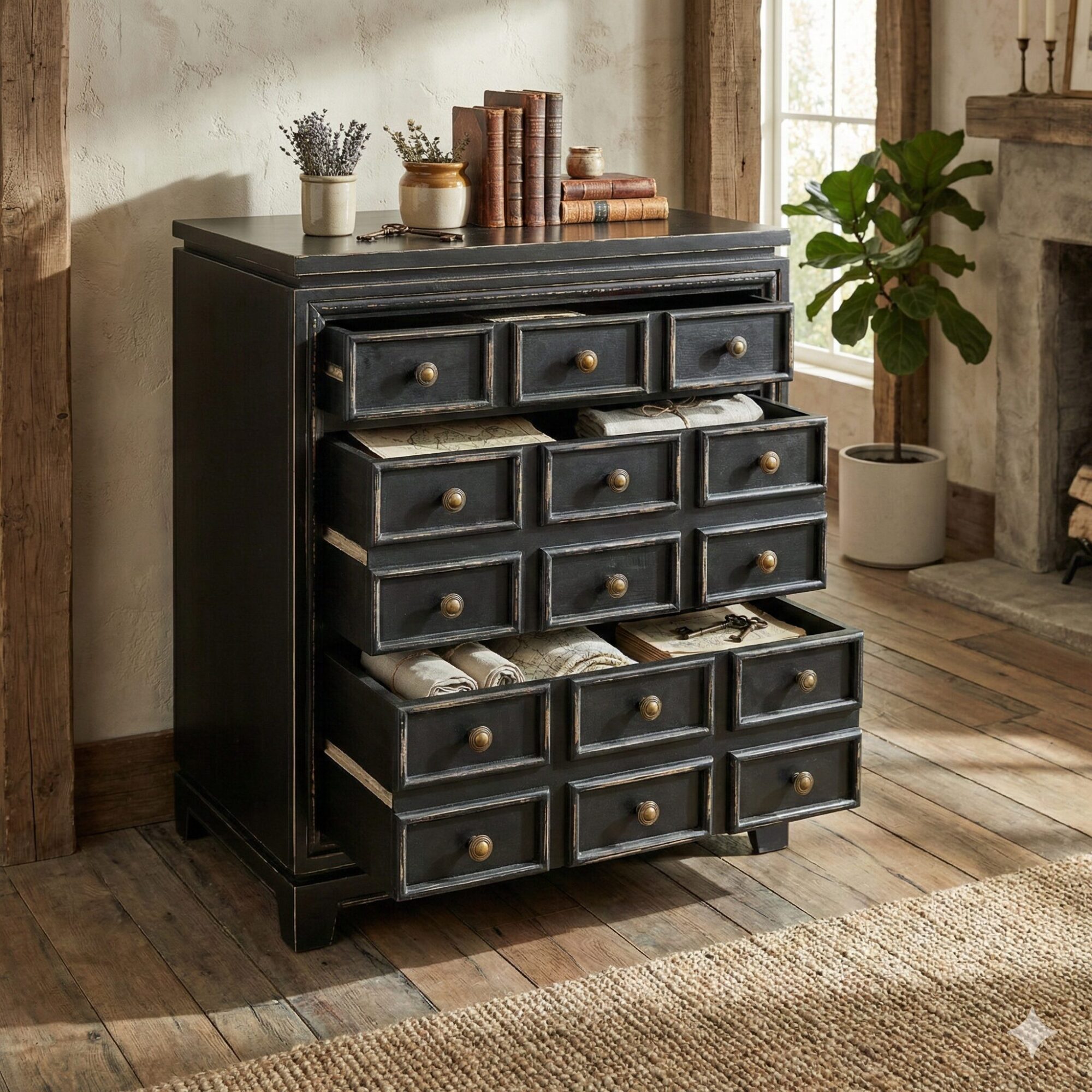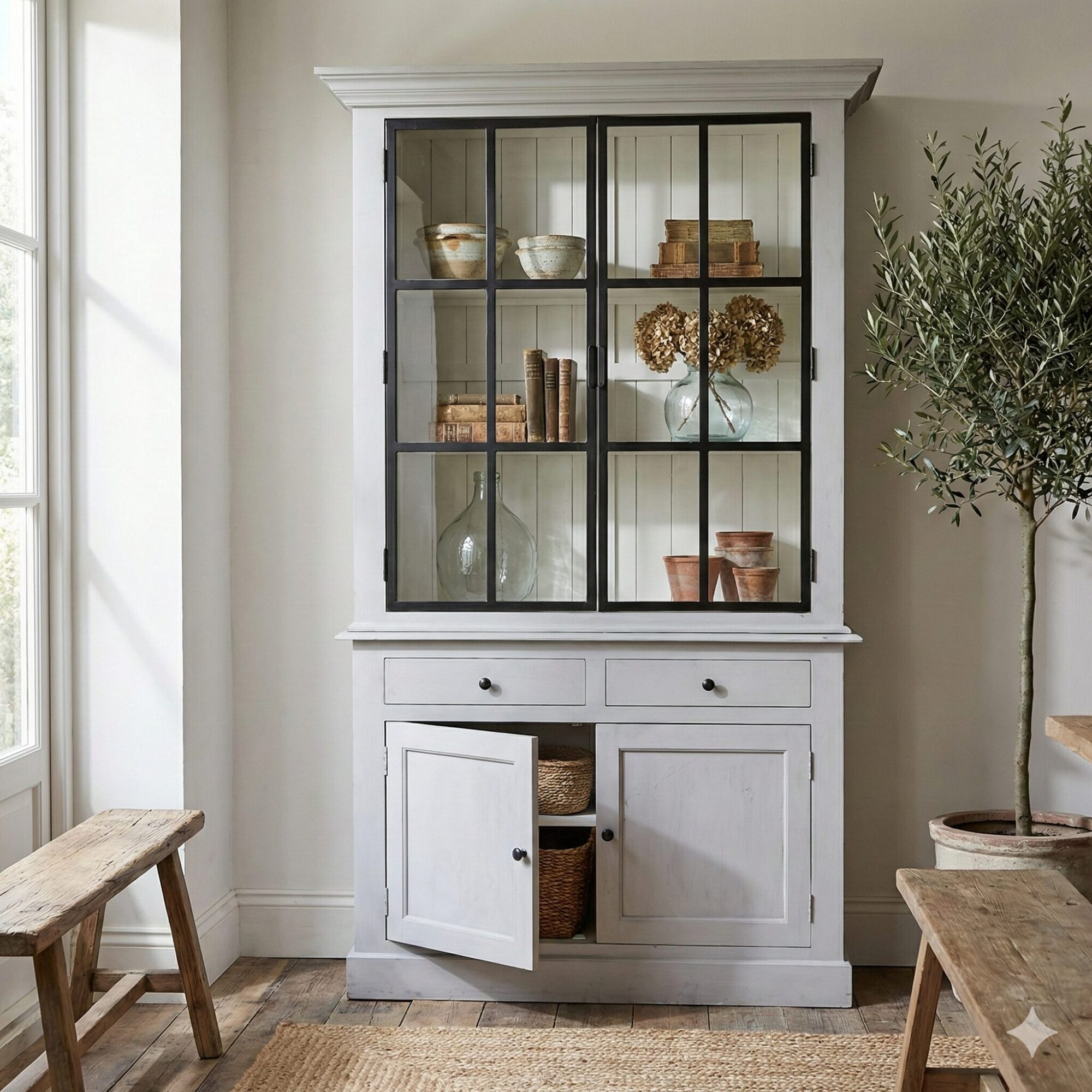 Dieser Schrank besticht durch seinen antiken Reiz und das markante Design, das ihn zu einem echten Hingucker macht. Die Farbgebung der Außenseite harmoniert perfekt mit der natürlichen Rückwand im Inneren und erzeugt so eine gemütliche, einladende Atmosphäre. Durch seine klare Linienführung und die Glasfronten wird der Inhalt des Schrankes optimal präsentiert. Die nützlichen Schubladen bieten zusätzlichen Stauraum. Egal ob im Wohnzimmer, Esszimmer oder Flur, dieses Möbelstück verbindet praktischen Nutzen mit zeitloser Schönheit.