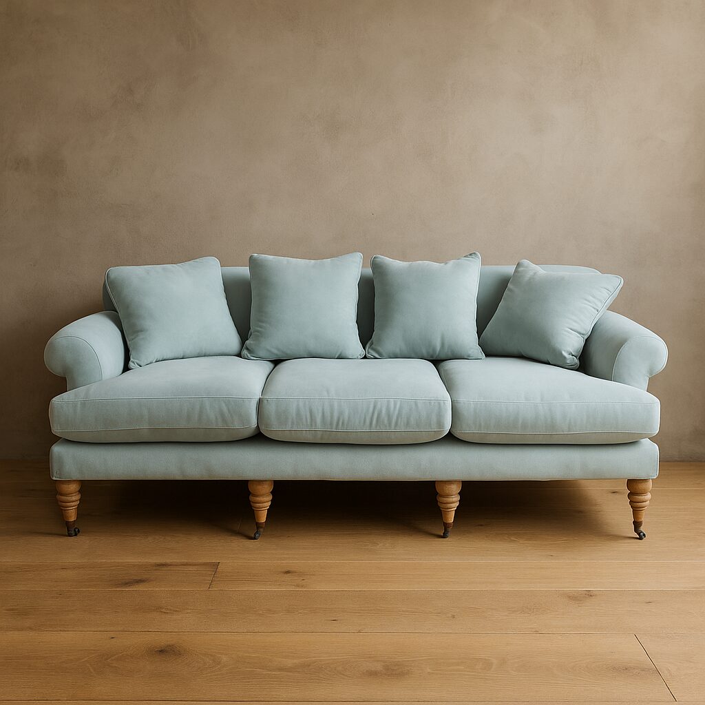 Der Wunsch, sich in den eigenen vier Wänden zu vergraben und sich wohlzufühlen, bleibt bestehen. Dazu ist ein komfortables Sofa im Wohnzimmer unerlässlich. Ein Sofa, das Ihnen ultimativen Komfort bietet – ob Sie gerade einen Film sehen, in einer Ecke ein Buch lesen oder sich einfach nur ausstrecken, um Ihre Beine zu entspannen. Dank seiner großzügigen Breite bietet das Sofa bei Bedarf auch drei Gästen einen bequemen Sitzplatz. Ein stabiles Gestell aus massivem Mangoholz und eine hochwertige Polsterung sorgen für ein luxuriöses Sitzgefühl. Der Bezug, der in zwei Farben und Stoffqualitäten erhältlich ist, ist das Highlight. Der blaue Stoff ist ein luxuriöser, weicher Baumwollsamt, während der helle Stoff ein Viskose-Baumwollgemisch mit einem subtilen Fischgrat-Design ist. Zu jedem Sofa gehören neben zwei großen Sitzkissen auch vier kleinere Kuschelkissen. Kunstvoll handgedrehte Füße vervollständigen das elegante Erscheinungsbild des Sofas. Die beiden vorderen Füße sind zusätzlich mit Rollen ausgestattet, was das Sofa bei Bedarf mobil macht. Achten Sie jedoch darauf, dass der Untergrund robust ist.