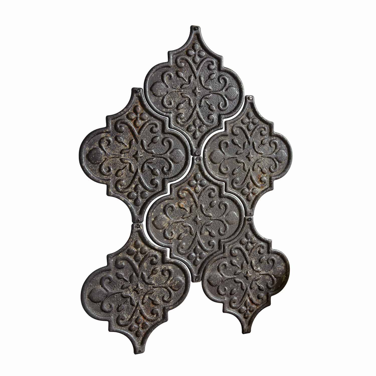 Dieses handgefertigte Wandornament aus widerstandsfähigem Eisen entführt Sie in eine Welt voller historischer Pracht. Seine einzigartige Aura entsteht durch das kunstvoll gestaltete Muster und das authentische Antik-Finish, das einen nostalgischen und dennoch stilvollen Charme ausstrahlt. Die dunkle Patina und die feinen Details des Ornaments erzählen Geschichten aus der Vergangenheit und bringen einen Hauch von Vintage-Charme in Ihre Wohnräume. Ob als eigenständiges Kunstwerk an der Wand oder in Verbindung mit anderen Dekorationsstücken, dieses Wandornament ist ein wahrer Blickfang und schafft eine Atmosphäre von majestätischer Schönheit. Die Montage ist einfach, da die einzelnen Elemente entweder genagelt oder an die Wand geklebt werden können.