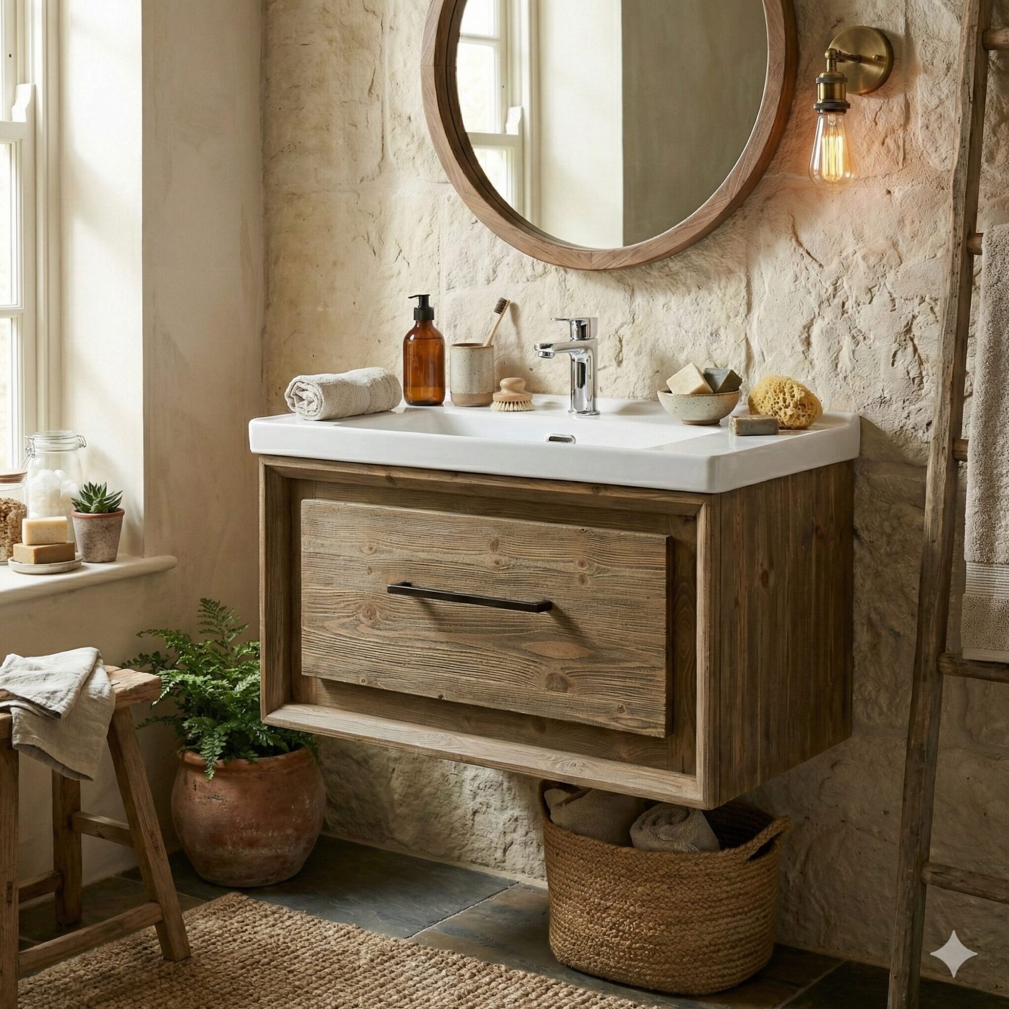 Mit diesem traumhaft schönen Waschtisch wird Ihr Badezimmer zum absoluten Highlight des Hauses. Ästhetik und meisterhaft verarbeitete Materialien kommen hier zusammen und ergeben ein tolles Gesamtbild. Der Korpus und die Türen dieses Must-Haves für Liebhaber des Shabby-Chic sind aus echtem Tannenholz gefertigt. Die gewischte Optik des Holzes verleiht einen gewollten Vintage-Charme. Das Waschbecken aus Keramik ist von einer edlen Marmorplatte umgeben. Die zauberhaften Lamellentüren sind mit einer aufwendig gestalteten Strebe verschließbar. Im Inneren des Waschtisch-Schränkchens können Sie Beautycase, Haarbürste, Cremes und Lotionen verstauen. Auch Handtücher, Waschlappen, Zahnbürste und Haartrockner lassen sich wunderbar hinter den pittoresken Türen aufbewahren. So bleibt das Badezimmer ordentlich und luftig. Dieser harmonische Anblick trägt zum ruhigen Ambiente im Bad bei. Der herausnehmbare Einlegeboden ermöglicht es Ihnen auch, Platz für größere Gegenstände im Schrank zu schaffen. Ein Platzwunder, das sowohl durch Funktionalität als auch Design überzeugt.
