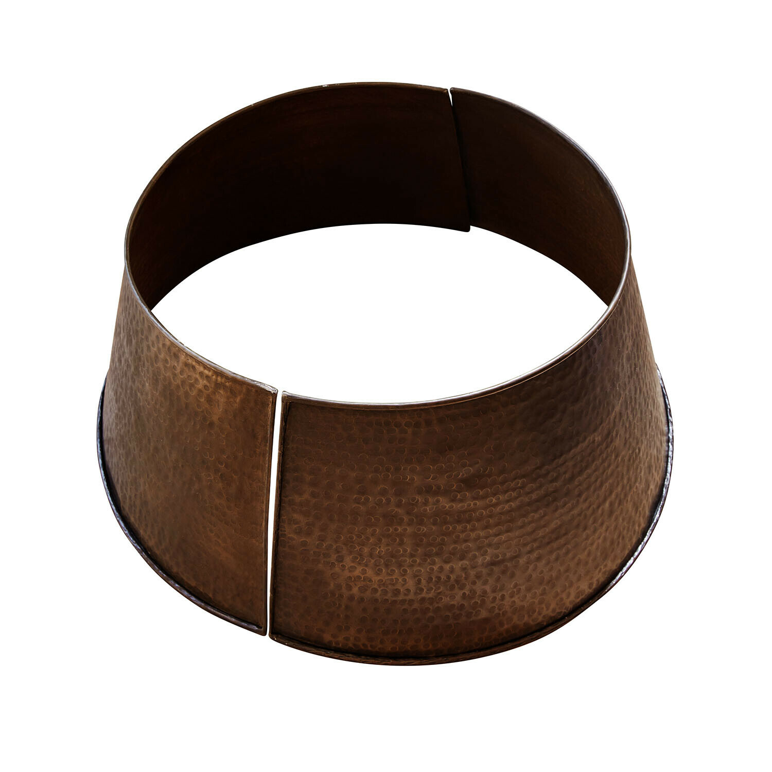 Der Weihnachtsbaum bildet das Herz einer jeden festlichen Dekoration und mit dieser kunstvoll gestalteten Umrandung erhält er einen eleganten Rahmen. Dieses Stück, aus Aluminium gefertigt, überzeugt mit seiner handgehämmerten Oberfläche, die dem Material eine gewisse Tiefe und Spur von Handwerkskunst verleiht. Der warme Metallton strahlt sowohl Modernität als auch Gemütlichkeit aus, perfekt für eine winterliche Atmosphäre mit Persönlichkeit. Die geteilte Form ermöglicht eine unkomplizierte Montage und verbirgt den oft unschönen Baumständer vollständig. Auf diese Weise entsteht ein harmonisches Gesamtbild, das vom Baumgipfel bis zum Boden reicht.